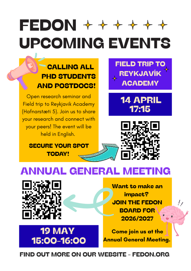 Við viljum sérstaklega hvetja áhugasama til að bjóða sig fram til starfa í stjórn FEDON fyrir skólaárið 2026/2027! FEDON er stendur vörð um réttindi allra nýrannsakenda við háskólann okkar og við skipuleggjum einnig félagslega viðburði og málstofur til að sameina félagsmenn. Við hvetjum ykkur eindregið til að sækja um, óháð því hversu langt þið eruð komin í námi eða rannsóknum sem nýdoktor, hvort sem þið sitjið í stjórnum annarra doktorsfélaga, óháð bakgrunni, fræðasviði eða hvort þið talið íslensku eða ensku. Því fleiri sem sitja í stjórninni, því auðveldara er að skipta verkum og hafa áhrif.